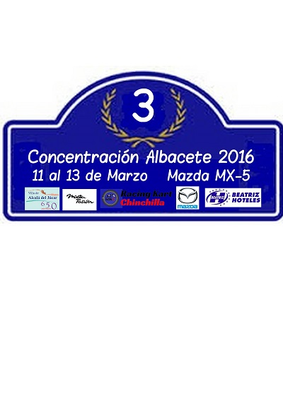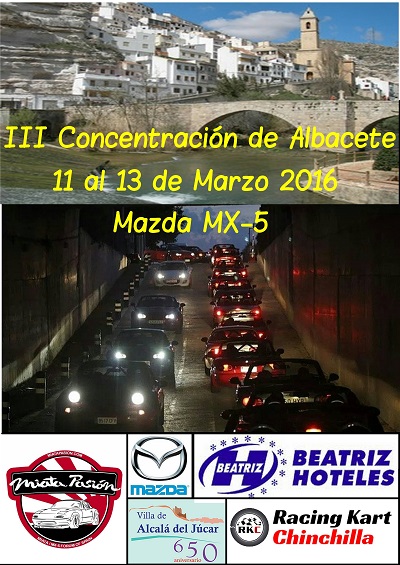 Abro la carpeta de la 3 Concentración Nacional de Mazda Mx5 en Albacete en Marzo del 11 al 13, cada año intento mejorarla para la gente que venga a pasar un buen finde por tierras castellano-manchegas, este año la hemos preparado con ruta y con unos Karts el domingo, el recibimiento será en Hotel Beatriz con una cena, al dia siguiente la ruta va a ser muy divertida, va a ser por las Hoces del Júcar 1h,22 con 67 km la carretera va ir bordeándola casi todos los km con unos parajes dignos de admirar y con curveo del bueno, visitaremos el pueblo de Alcala del Júcar donde con una guía, visitaremos sus calles y cuevas, la cueva del diablo y masago si quereis mas info visitar su pagina web http://alcaladeljucar.net/menu.htm allí encontrareis todo lo que se podrá ver en Alcala del Júcar comeremos en un restaurante típico de la zona con comida de la zona, saldremos para Albacete donde al llegar allí haremos un descanso, cenaremos en el Hotel Beatriz y luego quien quiera saldremos para el centro de Albacete para ir de copas, al dia siguiente disfrutaremos en Chinchilla en su circuito de Karts a las 11 de la mañana, allí haremos 3 tandas de 10 min cada una, el precio son 38 euros las tres tandas, después de disfrutar de los karts iremos a Chinchilla a comer al restaurante Meson Manchego donde disfrutaremos de una comida típica de la zona y daremos por finalizada la concentración, el plazo de inscripción es hasta el 1 de Marzo, apuntarosssssssssssssssssss