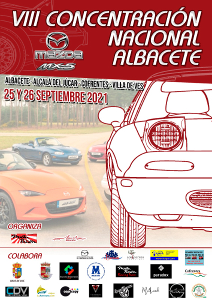 Hola a todos miateros, queria anunciaros con mucha ilusion y esfuerzo, vamos a realizar nuestra VIII Concentracion Nacional en Albacete 2021, despues de esta maldita pandemia e impedir poder realizar una vida normal, parece que la vacunacion y los riesgos van siendo menores, por eso la vamos hacer el 24, 25 y 26 de Septiembre, es una buena fecha, y creemos que mejora cada dia mas, la haremos en Mx5land-Finca los Olivos en Alcala del Jucar, daremos la bienvenida con una cena el dia 24, como todos estos años atras, el 25 saldremos bastante temprano,, a las 7,30 en el parking del hotel, salida a las 8,30 horas sin esperas para hacer una pequeña ruta entre las provincias de Albacete y Valencia, llegaremos a Cofrentes donde aparcaremos los coches en el polideportivo municipal, reservado para nosotros, se harán dos grupos uno a las 10 y otro a las 11,30 disfrutaremos de un viaje fluvial por el rio Jucar hasta Cortes de Pallas, el otro grupo realizaran con guia turistica un paseo por el pueblo, luego se hara a la inversa, alli regresaremos e iremos a comer por la zona, despues de comer haremos una visita al castillo, de regreso realizaremos otra ruta por los bellos parajes del Cabriel, por la noche cenaremos y se realizara los sorteos de regalos y demas cosas que se daran a los asistentes, a la mañana siguiente del Domingo iremos por una bella ruta y bajaremos al embalse el Molinar, iremos despues a comer al Restaurante playa de Jorquera, un lugar de privilegio a la orilla del Jucar, aun quedan muchos flecos y mas cosas que realizar, pero con mucha ilusion y esfuerzo, espero que vengais a pasarlo genial, fecha de incripcion 23 de Mayo hasta 10 de Septiembre a las 00,00, ire poniendo informacion conforme se vayan cerrando, un saludo a todos, OS ESPERO
