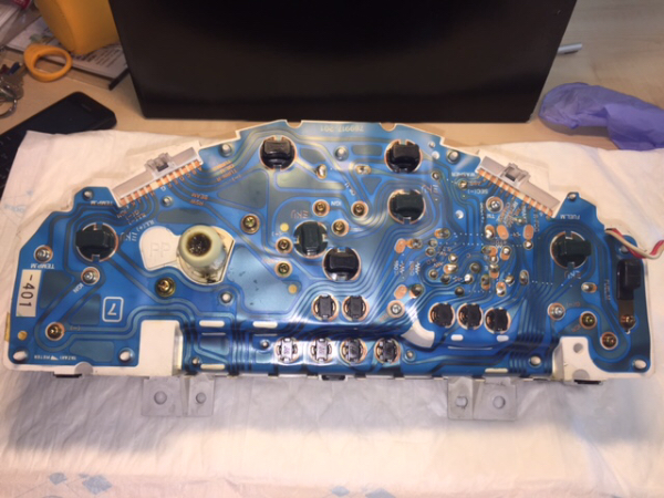 El siguiente paso puede herir susceptibilidades. Los testigos en la esfera del cuentarrevoluciones están cubiertos por plástico, este plástico evita que se ilumine la totalidad de la nueva esfera, ahora los 0kph están hacia las 6, así que necesitamos luz allí... tomamos el cortador diagonal y sacamos eso a bocados... consejo: mi cortador era pequeño, habría sido más fácil con uno mediano.