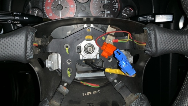 Removemos la tapa inferior que oculta la columna de dirección y los cables. Hay un conector blanco grande (mandos de la columna) y si teneis airbag, otro azul y naranja; hay que desconectar los tres (el blanco, y los dos del airbag (uno azul y otro naranja), en la parte superior del blanco, hay una pestaña que hay que presionar mientras se separan las piezas, el conector naranja sale antes que el azul, ambos tienen una pestaña que indica hacia donde hay que presionarla (dice PUSH). Lo siento, no hice fotos, pero es explícito. Hecho esto, sacamos toda la pieza. Si separamos debajo los cables, podemos apartar la membrana del airbag; pero no es preciso hacerlo