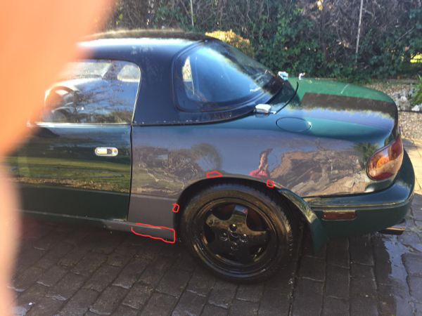 Y por ultimo con lo que me encuentro ahora mismo, chapa y pintura, hace tiempo que tengo el coche parado con todo el tema este pero por temas de trabajo mio, y de mi padre que al final es el mecánico (de motos pero mecánico al fin y al cabo), que sin su ayuda voy jodido sobre todo en el tema pintura, pues poco puedo avanzar. Como escribí en el primer mensaje de todos, el coche estaba bastante mal de chapa, tenia oxido y muchísimos rallazos. Por lo que toca pintarlo entero, del verde racing green de serie, además le voy a montar un lip delantero, y unas taloneras, que me gusta mucho como le quedan.